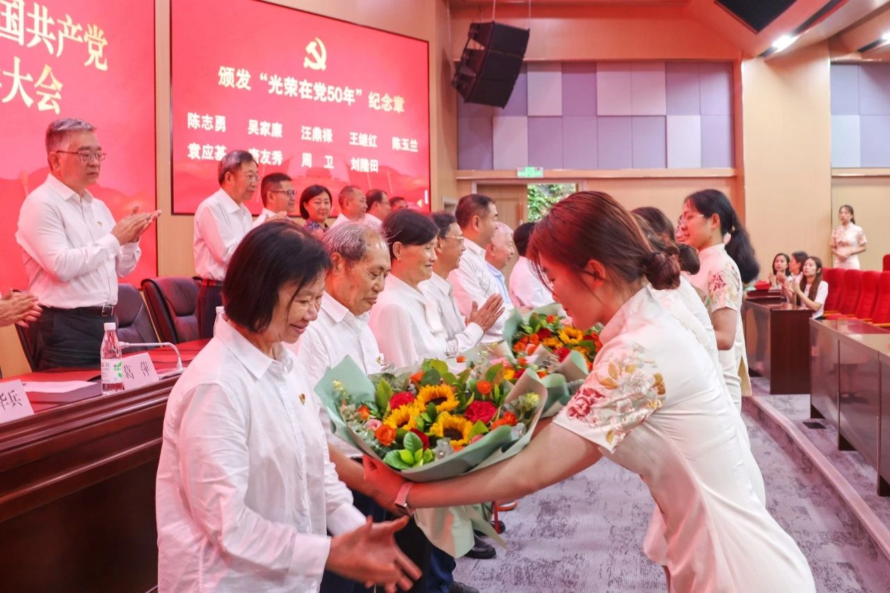校党委副书记冯跃林主持大会。出席大会的领导向米兰官方端网站及各附属医院党龄达50年的老党员颁发“光荣在党50年”纪念章。陈志勇、吴家廉、汪鼎禄、王继红、陈玉兰、袁应基、唐友秀、周卫、刘隆田等9名“光荣在党”50年的老党员代表在现场获颁纪念章。