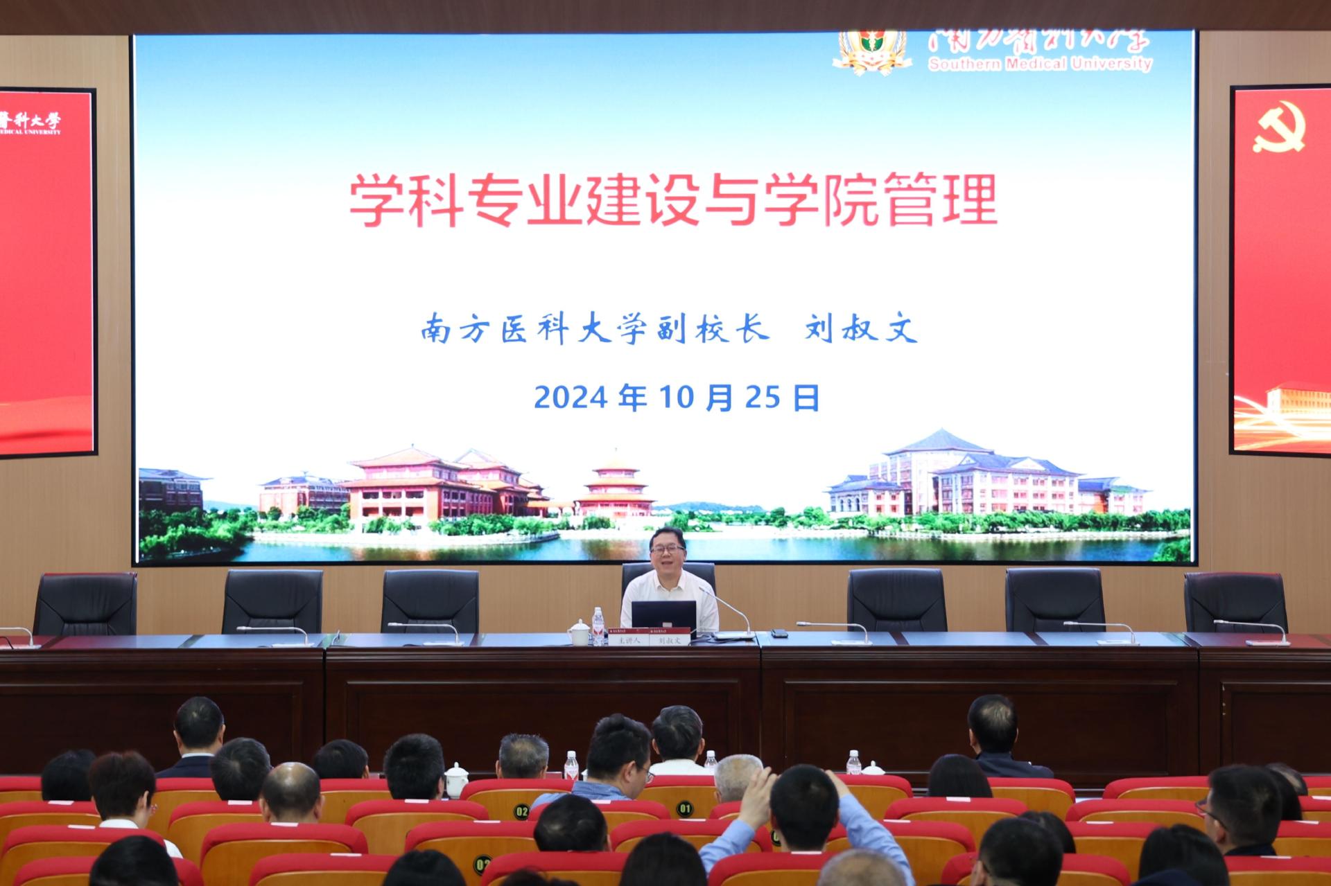 刘叔文围绕“学科专业建设与学院管理”主题,从“高校治理的重点是学科建设”“学科建设的内涵”“学科建设与学院管理”“学科交叉与新医科建设”“南方医科大学新医科的探索与实践”等五个方面作了深入系统地讲解。他指出,学科能力与学科素养是教师育人的基础,大学的规划关键在于规划学科布局,应始终坚持以学科建设为导向,推动医学与理学、工学的深度融合,在新医科人才培养上不断实践与探索。