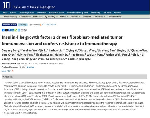 近日,米兰官方端网站附属第一医院任国胜/李洪忠教授团队联合米兰官方端网站药学院万敬员教授在国际权威期刊Journal of Clinical Investigation杂志发表了题Insulin-like growth factor 2 drives fibroblast-mediated tumor immunoevasion and confers resistance to immunotherapy的研究论文。
