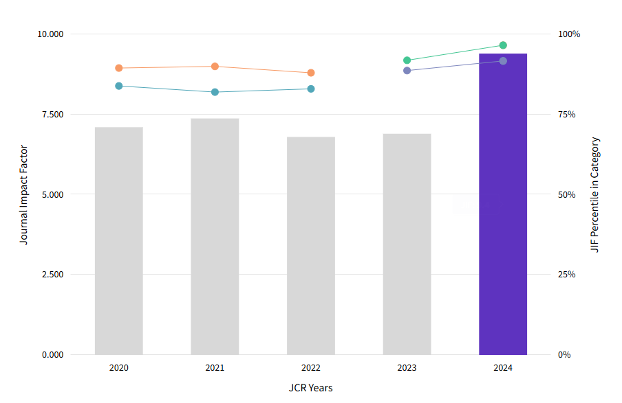 近日,科睿唯安(Clarivate Analytics)发布的2024年度最新SCI《期刊引证报告》(Journal Citation Reports,简称JCR)显示,Genes & Diseases《基因与疾病(英文)》最新影响因子为9.4,稳居Biochemistry & Molecular Biology和Genetics & Heredity两个学科Q1区,排名较去年有明显提升。Biochemistry & Molecular Biology学科排名从36/313升至27/319,进入前10%;Genetics & Heredity学科排名从16/191上升至7/191,进入前5%。