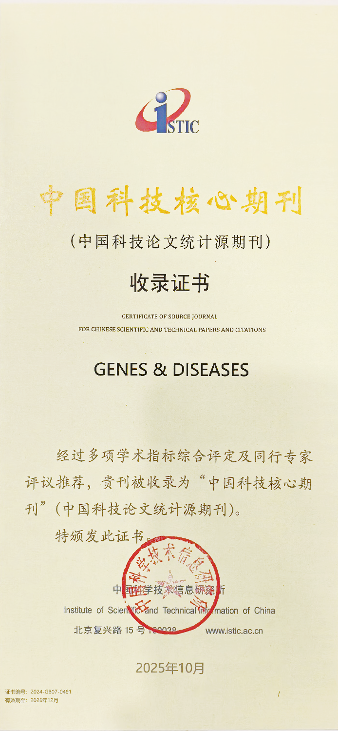 Genes & Diseases作为聚焦分子生物学与转化医学的生物医学综合性英文科技期刊,已被SCIE、Scopus、PMC、DOAJ、CAS、CA、OAJ、WJCI、中国科学引文数据库(CSCD核心库)等权威数据库收录,在Genetics & Heredity学科排名第7位,位列前3.7%;在Biochemistry & Molecular Biology学科全球排名第27位,位列前8.5%,已具有较高的国际学术影响力。连续获得国家级重大期刊专项——中国科技期刊卓越行动计划高起点新刊项目和二期英文梯队期刊项目。该刊蝉联“中国最具国际影响力学术期刊Top5%”,历获“中国高校杰出科技期刊”等荣誉,正向建设世界一流科技期刊的目标稳步前行。