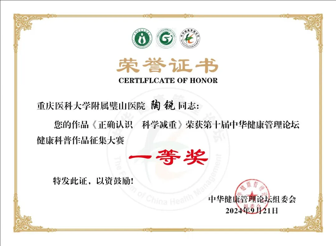 近日,附属璧山医院肥胖与代谢病中心负责人陶锐教授选送的科普作品《正确认识,科学减重》在全国众多参赛作品中脱颖而出,获第十届中华健康管理论坛科普作品征集大赛一等奖。