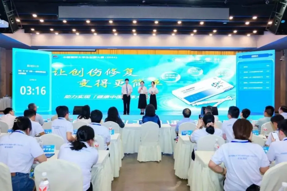 此次医院获奖团队由王珊、杨梓心、王雪玉、何之睿、蹇光宇、何清清、陈媛、白雅馨、谭浩、陆沁怡、朱星宇、樊栋奇、冒淙秀、陈勋奇、董小茹等15名优秀学子组成,在陈陶教授等指导教师的指导下,团队借鉴海洋生物的独特黏附机理,创新性地开发出具有完全自主知识产权的贻贝仿生医用快速粘合剂。该项目突破了传统医用粘合剂在粘接强度、生物相容性等方面的技术瓶颈,通过独创的分子结构设计和制备工艺,实现了对创面的快速、安全、有效粘合。