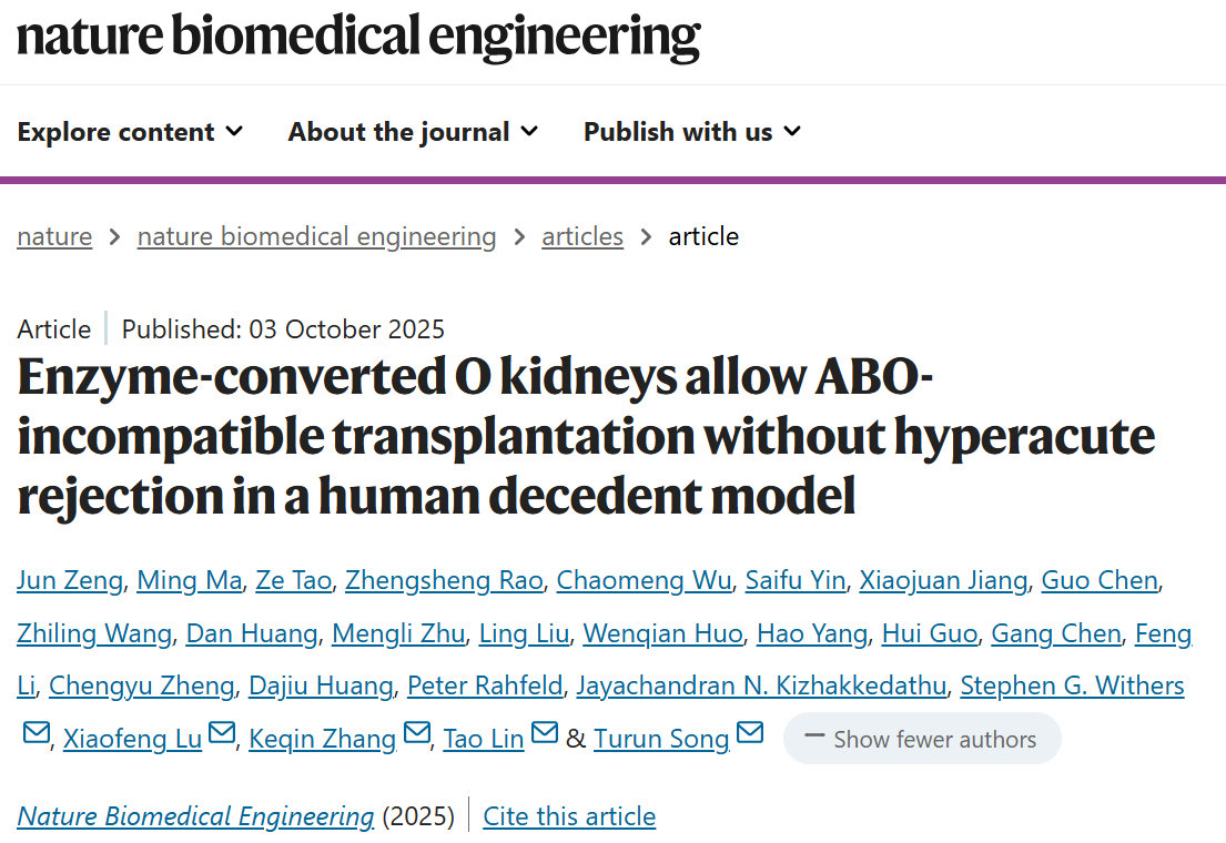 10月3日,米兰官方端网站附属第二医院与四川大学华西医院联合研究团队在顶刊Nature Biomedical Engineering发表了将A型肾脏经酶转化变为“通用O型”肾脏,并成功移植给跨血型受者的研究成果。这是继今年初完成B型肾脏转化移植后,该团队在一年内取得的第二项世界级突破,标志着我国在跨血型器官移植领域全球领先。