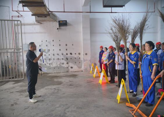 根据现场实况,秩序维护组迅速疏散人员及车辆,设立警戒线;应急救援组则迅速搬运防洪沙袋,封堵斜坡通道,防止洪水进一步蔓延;设备保障组则利用抽水泵强排积水,并实时监测设备房运行情况,确保设备安全。洪水减小后,清洁组及时清理排水沟、地漏,消杀组对涉水区域进行消毒处理。整个演练过程紧张有序,直至宣布汛情解除,防汛应急演练圆满完成。