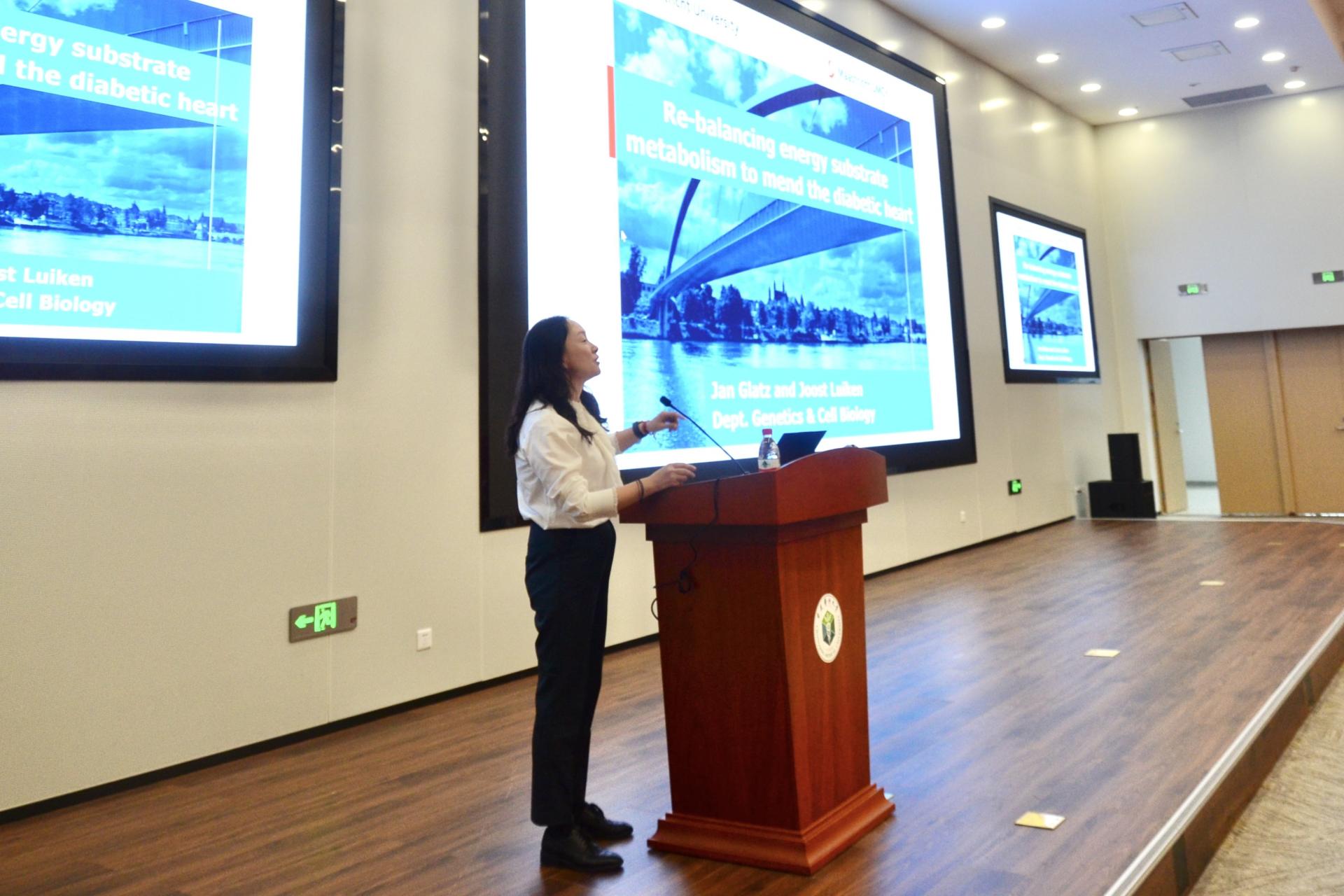 荷兰马斯特里赫特大学-遗传&细胞生物系副主任Luiken教授围绕平衡营养物质的摄取利用可改善心脏功能进行讲解。讲解分为三个方面,营养物质平衡理论在糖尿病心肌病中的应用以及CD36与V-ATPase酶的作用;SNARE蛋白和脂滴在心脏营养物质平衡的作用;脂质诱导的心脏胰岛素抵抗的可代替机制。讲解过程中Luiken教授以壮丽山野景色为同学们传递了积极乐观的生活方式,引发在场师生共鸣。