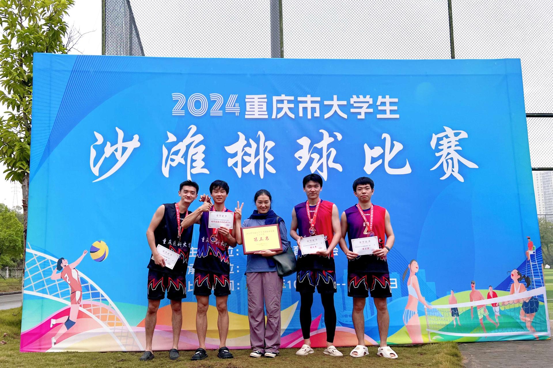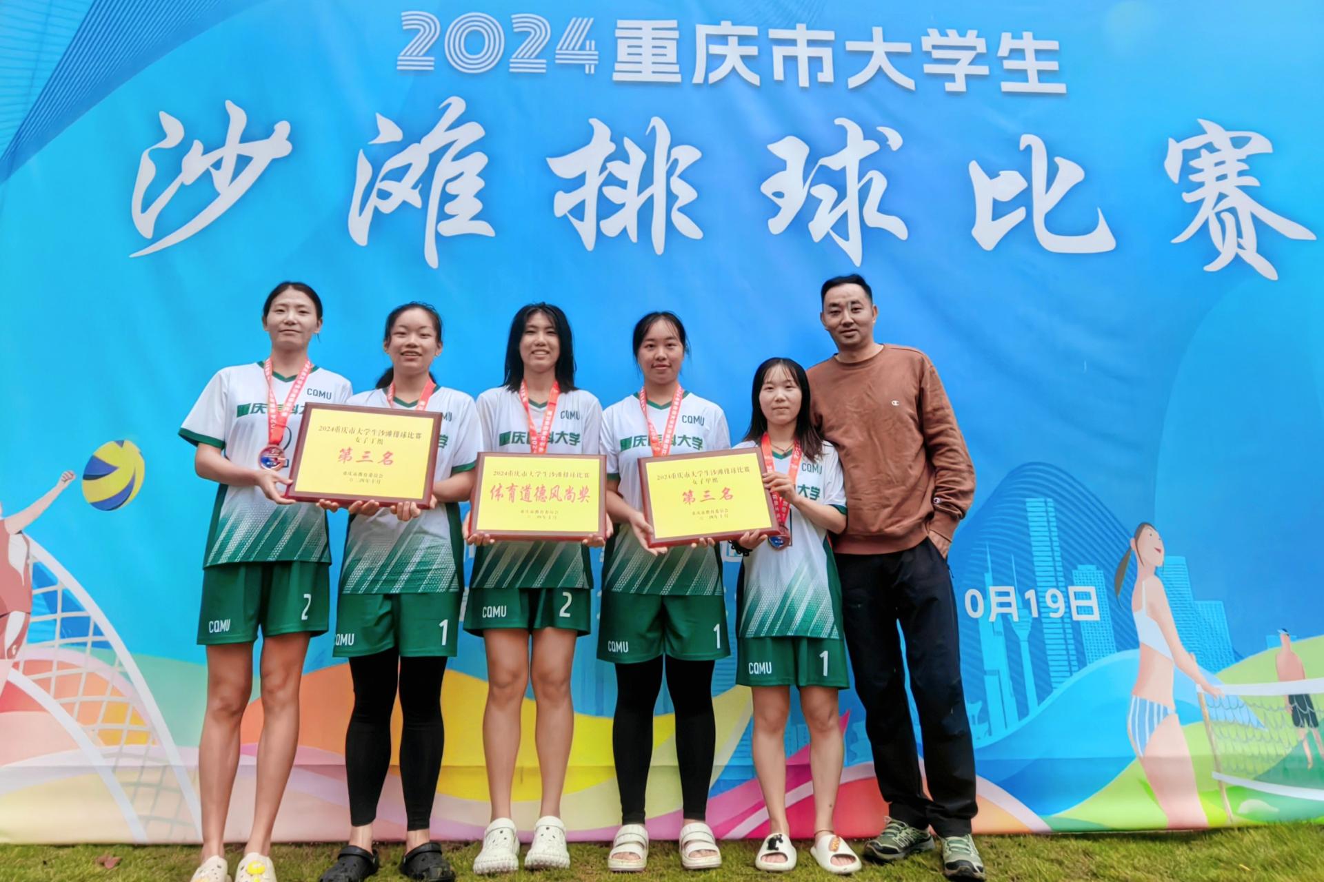 10月19日,2024年重庆市大学生沙滩排球比赛在重庆移通学院落幕。本次比赛由重庆市教委主办,重庆移通学院承办,共有来自重庆24所高校47支队伍参赛。我校女子沙滩排球队教练邓洪波带领5名运动员,获得女子甲组第三名、女子丁组第三名的优异成绩。男子沙滩排球队教练韩小兰带领4名队员,获得男子甲组第三名的优异成绩。同时,获得体育道德风尚奖。