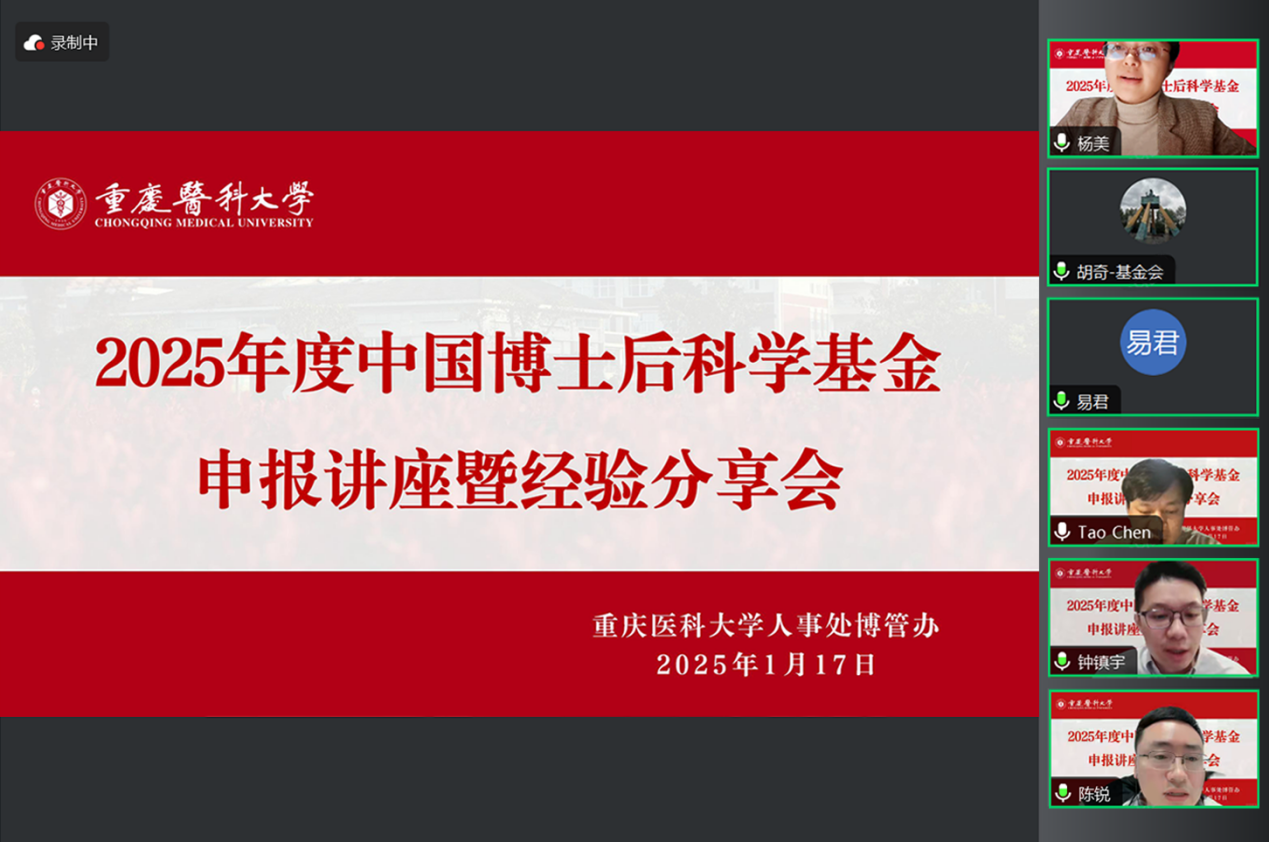 为进一步提升米兰官方端网站博士后基金申报质量,1月17日晚19:00,米兰官方端网站举办2025年度中国博士后科学基金项目线上申报讲座暨经验分享会。此次会议邀请了中国博士后科学基金会基金管理处副处长胡奇,重庆市人力社保局专技处处长、市博管办副主任易君,口腔医学院学术副院长陈陶教授,以及优秀博士后代表钟镇宇、陈锐为大家进行政策解读、申报动员与经验分享。300余位在站博士后、拟进站博士后及工作人员在线参会。会议由党委教师工作部(人事处)部(处)长杨美主持。