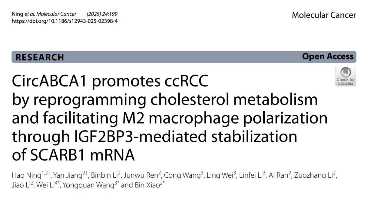 近日,我校药学院肖斌教授团队与陆军军医大学西南医院泌尿外科、重庆大学附属肿瘤医院药剂科合作在国际知名期刊Molecular Cancer上发表了题为CircABCA1 promotes ccRCC by reprogramming cholesterol metabolism and facilitating M2 macrophage polarization through IGF2BP3-mediated stabilization of SCARB1 mRNA的研究论文。