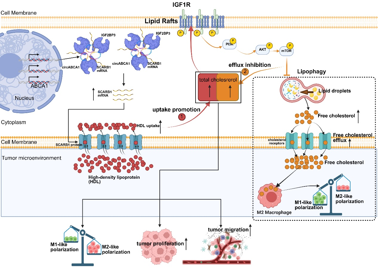 环状RNA(circular RNA, circRNA)是一类在真核生物中广泛存在的非编码RNA,通过复杂多样的机制,在肿瘤进展与代谢调控中起着关键作用。本研究新发现了一个在肾癌组织中异常高表达的circRNA:circABCA1,其表达水平与肿瘤恶性程度及远端转移显著正相关。该环状RNA通过直接结合IGF2BP3蛋白以及胆固醇摄取转运受体SCARB1的mRNA,形成circABCA1-IGF2BP3-SCARB1 mRNA三元复合体,特异性增强SCARB1的mRNA稳定性,从而促进ccRCC细胞对胆固醇的摄取。进一步,circABCA1-SCARB1轴不仅促进胆固醇摄取,还通过维持脂筏完整性,持续激活IGF1R/PI3K/AKT/mTOR磷酸化通路,进而抑制自噬介导的脂滴分解(脂噬),促进了胆固醇蓄积在脂滴。有趣的是,高表达的circABCA1通过驱动ccRCC竞争性摄取微环境的胆固醇,造成肿瘤微环境胆固醇水平降低,进而诱导M2型巨噬细胞极化,促进免疫逃逸。功能研究表明,敲除circABCA1可显著抑制ccRCC的增殖和转移,并抑制M2型巨噬细胞浸润;该效应依赖于敲除circABCA1后对SCARB1胆固醇调控通路的阻断。上述研究为阐明ccRCC的发生与转移、脂质代谢重编程机制提供了新思路,也为研发治疗ccRCC的新型核酸药物提供了新靶点。